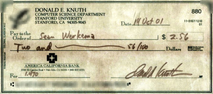 While finishing the first volume of TAOCP, Don’s typesetter mangled the manuscript’s mathematical equations. And of course, Don didn’t complain; he built a new system to fix it. That project became TeX, a typesetting language so precise that it remains the standard for mathematical and scientific publishing worldwide. And to this day, he offers anyone who finds a typo in his books a reward check for $2.56, that’s one hexadecimal dollar. Thousands have received them; most never cash them. I certainly didn’t cash mine.
